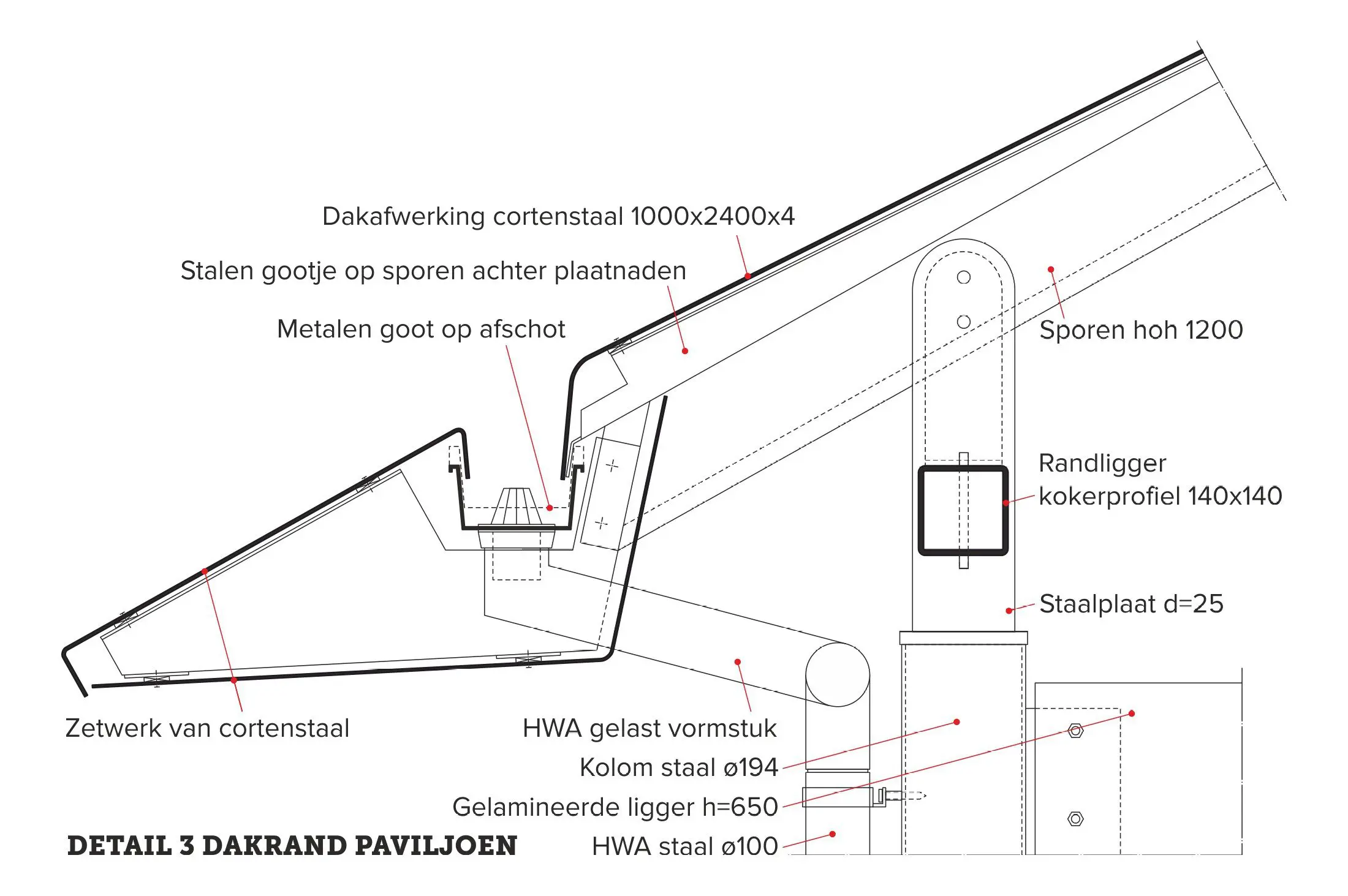 Het paviljoen wordt met een langgerekte en lichtgebogen kap afgeschermd tegen weer en wind en tegen de zon. De kap is voorzien van een bekleding van 2,40 meter brede cortenstaalplaten die in halfsteensverband zijn gelegd. Onder de open stootvoegen zijn op de onderliggende kokerprofielen gootjes aangebracht, die het regenwater naar de goot afvoeren.