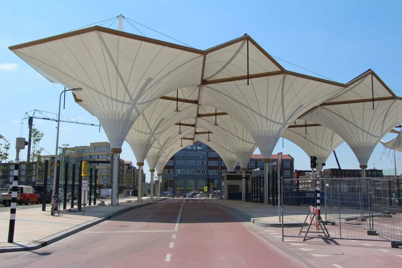 Het nieuwe busstation van Leidsche Rijn is ontworpen met de grootsheid van een gotische kathedraal, die vanwege de onderliggende tunnel uitgevoerd is in een zeer lichte constructie van stalen kolommen met gespannen membranen.