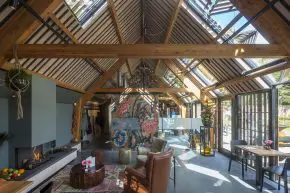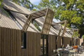 Hof van Duivenvoorde biedt ruimte aan een restaurant, een museumwinkel en de gidsen die bezoekers rondleiden over het landgoed. Het gebouw is relatief klein – 6 x 30 meter – maar voelt ruim aan door de hoge mate van transparantie. Van de ene kant van het gebouw kijk je helemaal naar de andere. De ruimte boven de restaurantkeuken (achterin het gebouw) en het sanitair-blok (in het midden) zijn open gelaten zodat de dakconstructie van voor tot achter zichtbaar blijft. Een aantal vaste ramen lopen over de nok door in het achterdakvlak, richting de monumentale tuinmuur.