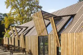 De tien beweegbare geveldelen van het bezoekerspaviljoen Hof van Duivenvoorde openen het gebouw in de morgen en sluiten het in de avond. In open vorm is het gebouw een licht restaurant, in gesloten vorm een schuur die verdwijnt in haar omgeving. Het ontwerp is gemaakt door architectenbureau 70F architecture.