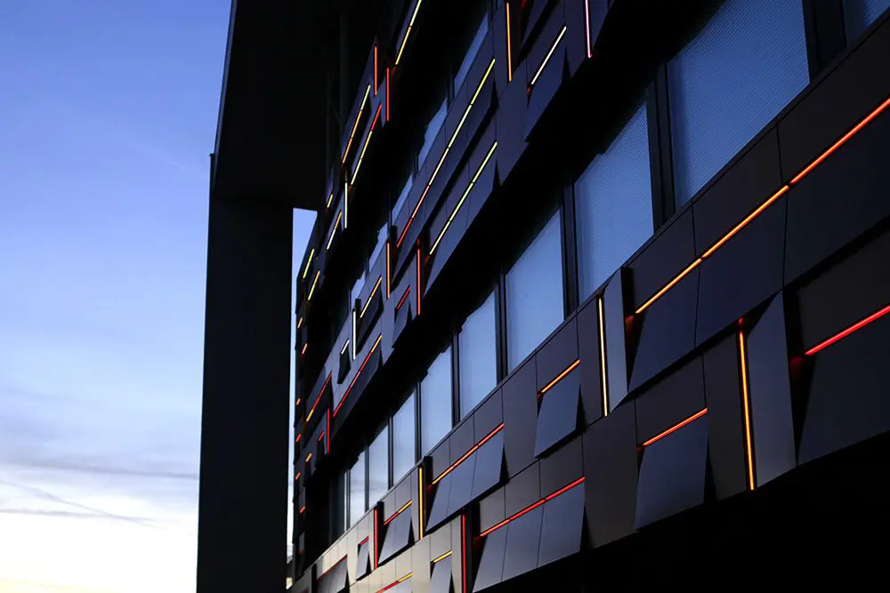 Gevel van kantoorgebouw van Kuijpers in Helmond, waarin met tapes verlijmde energieopwekkende gevelelementen zijn verwerkt.