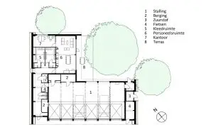 De gebogen vorm van het dak is overal in het interieur voelbaar. De houten spanten zijn overal in het zicht gehouden. Ter plaatse van de opengesneden hoek opent het gebouw zicht richting het bos, middels een 4 meter hoge houten pui.