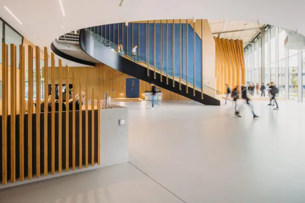 Transparantie was essentieel bij het ontwerp van Echo. Dat zorgt niet alleen voor maximaal daglicht in het gebouw (goed voor de gezondheid van gebruikers, maar ook een manier om te besparen op kunstmatige verlichting); het zorgt ook voor een visuele connectie met de rest van de campus en het omliggende groen. Daarmee wordt een ‘geïnstitutionaliseerde’ ervaring voor gebruikers voorkomen. Het open en publieke karakter van het gebouw verbindt beide kanten van de campus en zorgt voor een heldere, positieve en welkome omgeving voor medewerkers en studenten.