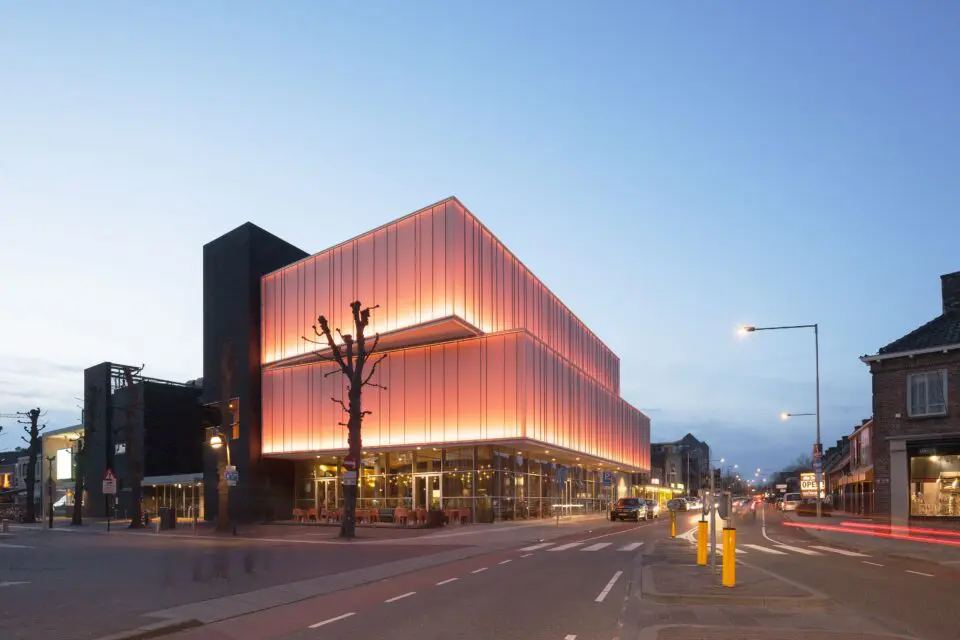 Theater Markant In Uden heeft een opgespannen polyester doek van in totaal 800 m2 als tweede façade. Het beige doek bestaat uit gecoat polyester en weegt circa 800 kg. Het geveldoek zit aan weerszijden vast in een 40 x 25 mm groot aluminium peesprofiel. Via een afrolstelling in een kraan werd het doek in de lengterichting afgerold en aan één kant met overlengte vastgezet in de pees. Daarna werd de andere kant vastgezet. Door het aandraaien van M10-bouten, waarmee het peesprofiel vastzit aan het stalen kader, wordt het doek gespannen. De ledverlichting aan de achterkant van de tweede gevel zorgt voor bijzondere lichteffecten.