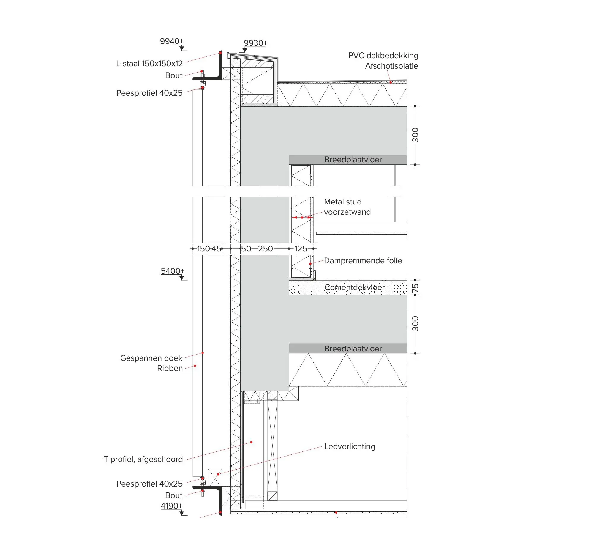 Theater Markant In Uden heeft een opgespannen polyester doek van in totaal 800 m2 als tweede façade. Het beige doek bestaat uit gecoat polyester en weegt circa 800 kg. Het geveldoek zit aan weerszijden vast in een 40 x 25 mm groot aluminium peesprofiel. Via een afrolstelling in een kraan werd het doek in de lengterichting afgerold en aan één kant met overlengte vastgezet in de pees. Daarna werd de andere kant vastgezet. Door het aandraaien van M10-bouten, waarmee het peesprofiel vastzit aan het stalen kader, wordt het doek gespannen. De ledverlichting aan de achterkant van de tweede gevel zorgt voor bijzondere lichteffecten.