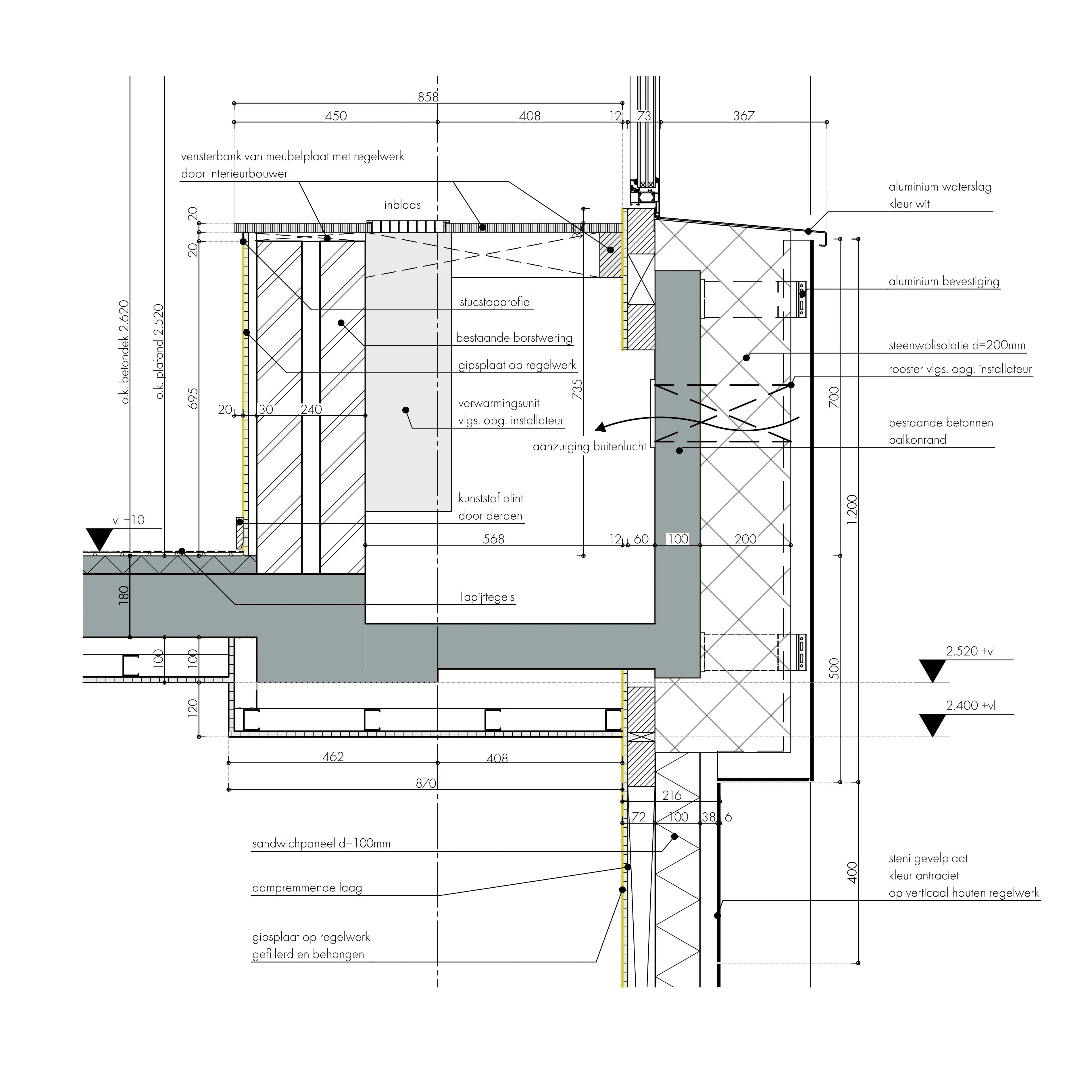 Om die redenen werden de balkons binnen de nieuwe thermische schil gelegd, inclusief de bestaande betonnen borstwering. De bestaande verdiepingshoogte was te krap om installaties weg te werken boven een verlaagd plafond. De oude balkons vormden hiervoor een mooi alternatief. Hierin zijn units geplaatst voor de inblaas van lucht, geschikt voor zowel verwarming als koeling. De installatiezone is aan de bovenzijde afgewerkt met een brede vensterbank die geïntegreerd is in het interieur van de hotelkamers, als legplank of zitruimte.
