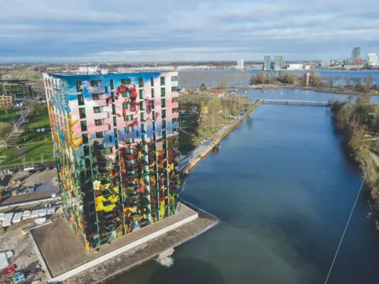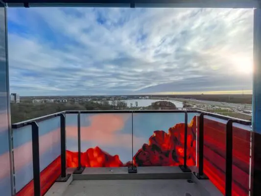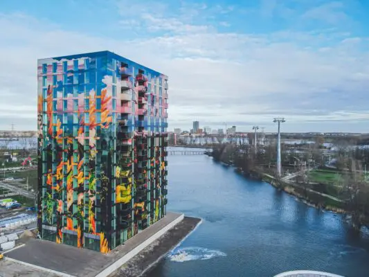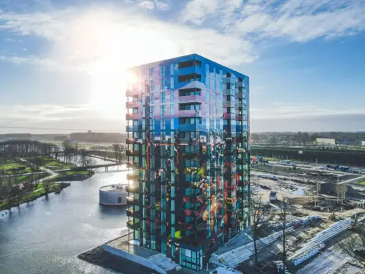 Pascal Fransman, Ontwikkelaar Dura Vermeer Bouw Hengelo: “Wij zijn enorm trots op het eindresultaat van deze prachtige toren. Het is een unieke locatie om een appartementencomplex te mogen ontwikkelen en realiseren. Het gevelkunstwerk maakt het extra bijzonder. Hiervoor is een bijzondere productietechniek toegepast door het kunstwerk op een glazen façade te printen. Het panoramische werk met de gevel als canvas blijft ook na de expo als eyecatcher behouden.”