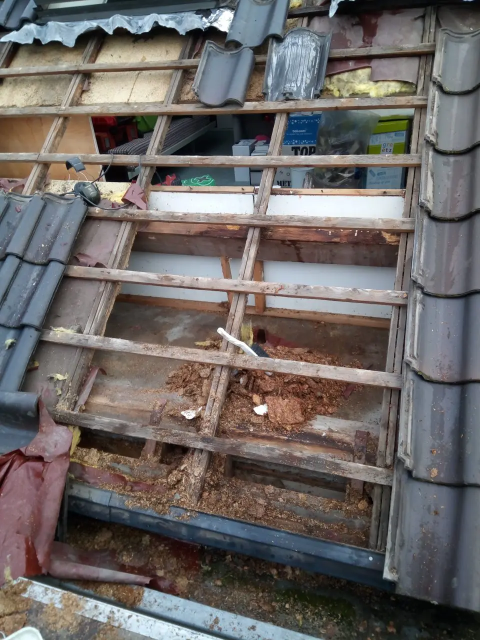 De ‘vakman’ die hier aan het werk was, heeft het lood onder het dakraam afgeklopt op verkeerd afgekorte dakpannen. In plaats van op maat gezaagd, zijn de pannen waarschijnlijk met een hamer knullig afgekort. De scherpe snijkanten van de pan hebben het lood beschadigd met lekkage en grote schade aan het dak als gevolg.