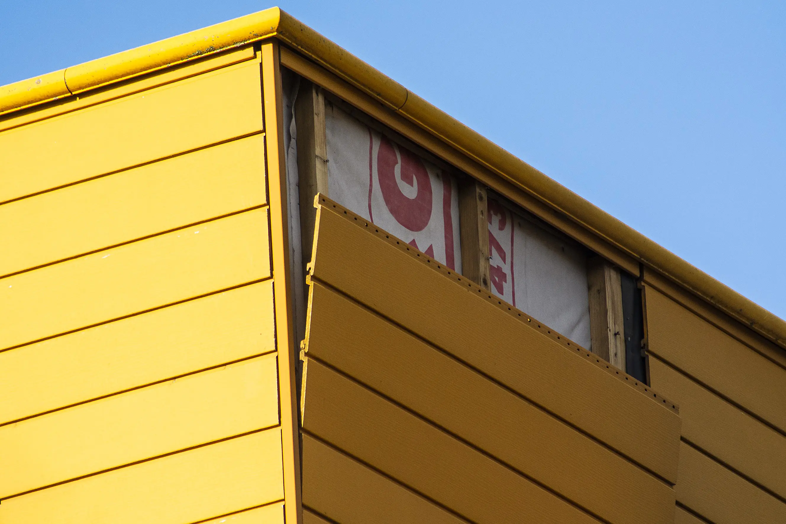 Aan de Wilhelmus Peekhof in Odijk, een dorp in de gemeente Bunnik, staan sinds 2007 tien woningen met forse gele uitbouwen in een bakstenen gevel. Ze zijn ontworpen door AA Architecten uit Ede. De gele gevelplaten begonnen in 2021 los te laten en naar beneden te vallen.