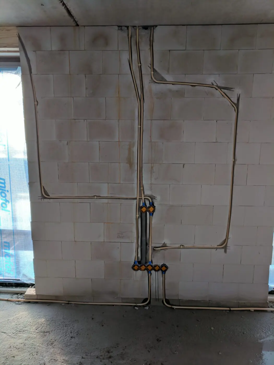 In eerste instantie nogal een janboel aan leidingwerk, maar als je er wat langer naar kijkt dan is het waarschijnlijk voor een groot deel nog wel te verklaren allemaal. Mijn eerste gok: dit is de opstelplek voor de televisie, onderaan een aantal wandcontactdozen en aansluitpunten van CAI en/of KPN. Daar boven een enkele wandcontactdoos en de doorvoer voor de signaalkabels om de tv op te hangen en alle kabels uit het zicht te houden. Die grijze PVC-buis zal dan bedoeld zijn voor bijvoorbeeld de HDMI-kabel. De horizontale buis links op de wand zal een functie hebben, vanuit de installateur gezien snap ik wel dat hij ‘m zo legt (die zal niet direct aan de constructie denken). Blijft over die ‘ringleiding’ rechts. Lijkt wel of men daar achteraf een aansluitpunt heeft gewijzigd of zo. Dat blijkt achteraf dus een dure aanpassing te zijn…