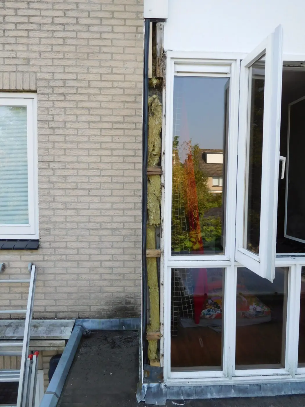 In verband met het aanpassen van de kozijnen is de met trespa afgewerkte hoek opengemaakt. De verticale afdichting van rubber hangt los, de isolatie is er ‘in gegooid’. De overgang van de bovenste naar de onderste strook trespa is met een afdichting van rubber waterdicht gemaakt. Helaas, het water dat tussen het naar achter gelegen paneel en de trespa komt, kan nergens heen. Het gevolg is dat het hout verrot is en de isolatie opgezwollen.