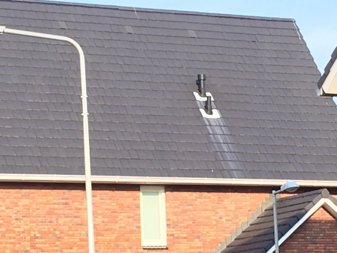 Dit zie je helaas wel vaker bij nieuwbouwwoningen: loodstrepen op donkere dakpannen. Technisch gezien geen probleem, maar wel behoorlijk ontsierend. En het kan nog makkelijk voorkomen worden ook, door het lood te behandelen of door simpelweg een loodvervanger te gebruiken.