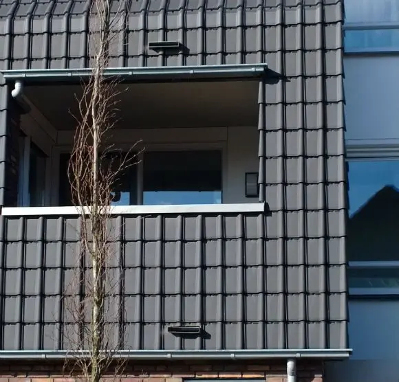 Lekker knus zo´n loggia´tje. Je kunt er je kont niet keren en het kost een massa daglicht. Voor de ontwerper kennelijk geen probleem want hij/zij hoeft er zelf toch niet te wonen. Wel heeft de ontwerper een droombeeld van pannen tegen een gevel. Dat werd 80 jaar eerder beter opgelost. Het hier getoonde tafereel verenigt de dodelijke combinatie van vormwil, gebrek aan gevoel voor esthetica, doorgeschoten regels en gebrek aan kennis en kunde in ons mooie vak. Gepruts in de marge: eenvoudig en smakeloos!