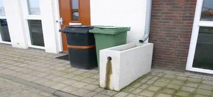 Open afvoer van hemelwaterafvoer is helemaal in. Althans bij ontwerpers. Of bewoners nu blij zijn met zo’n gore bak water bij hun voordeur, doet kennelijk niet ter zake.