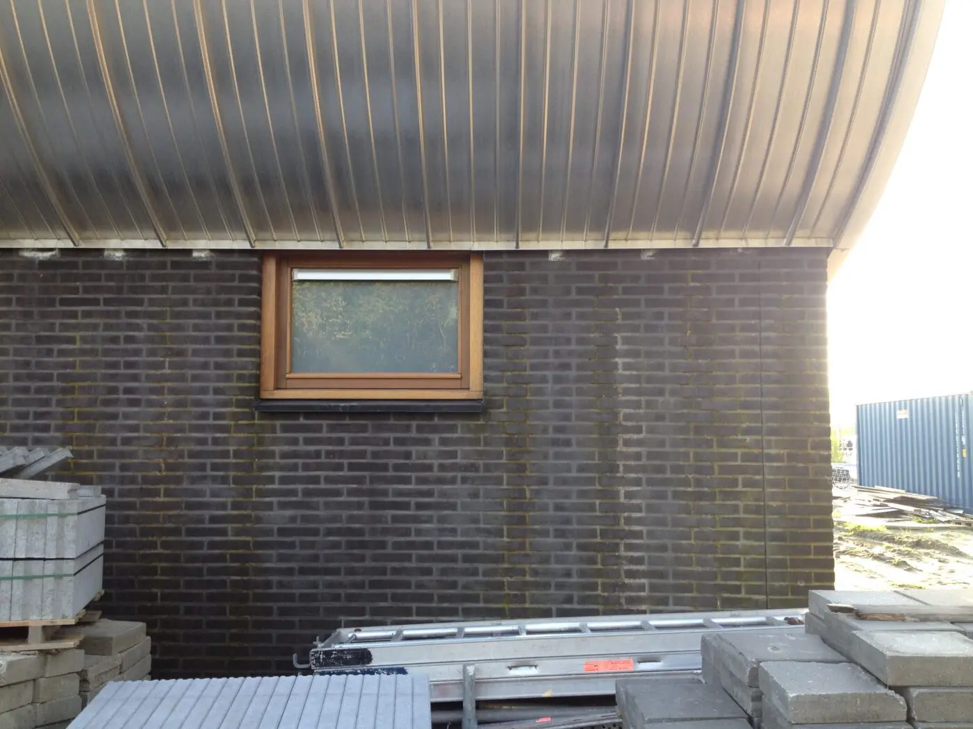 Gezien de vorm en afmeting van het afdak zal er ook veel water via de gevel naar beneden lopen. En inderdaad, dat kozijn kon ook een stuk lager.