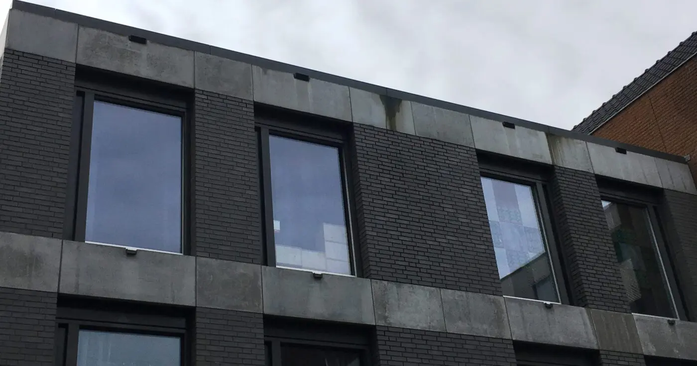 Dit is echter niet alles, er zijn ook bouwfouten. De bovenste band van de betonelementen heeft net onder de daktrim een kleine voorsprong, Ook leuk voor vervuilingen. De betonelementen hebben grote verschillen in oppervlaktestructuur waardoor de vervuilingen een sterk wisselend beeld geven, Enige nuance in structuur en daardoor vervuiling is prima, maar dit wordt een dambord. Verder geven geveloppervlakken met door hun materiaalkeuze een wisselende oppervlaktestructuur aanleiding tot ongelijke vervuiling door afstromende water. Dat geeft bij de bovenste betonband een hoge waterbelasting op het onderliggende metselwerk. Het voegwerk van de bovenste lagen van die gemetselde vlakken kleuren al donker. Dat fenomeen verergert met voegschade en algvorming tot gevolg. De betonbanden onder de raamkozijnen hebben kennelijk een dikke rand met vlakke bovenkant waardoor vuil water langs de voorzijde van de band loopt. Zie de vervuiling links en rechts van de spuwer. Het ziet er allemaal gewoon niet uit. Over 10 jaar moet alles opnieuw gevoegd en gekit en van ellende overgeschilderd. Als het gebouw er dan nog staat.