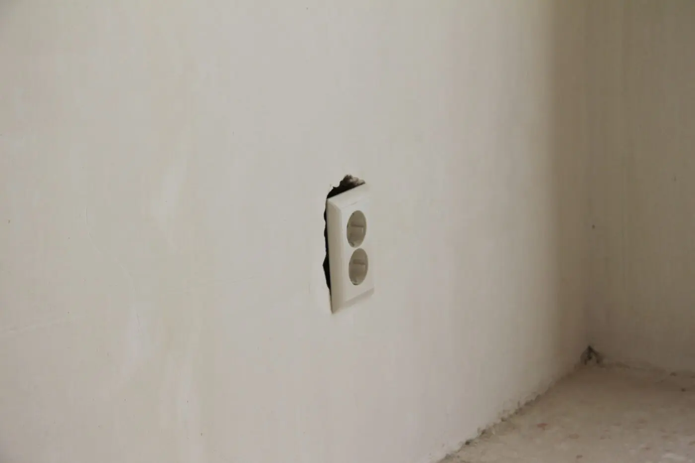 Ook binnen gaat er wel eens iets fout. Deze sparing is toch echt groter dan de ruimte die de wandcontactdoos afdekt. Het komt vast wel weer goed, maar waarom dan toch die contactdoos monteren als je ziet dat het niet past?