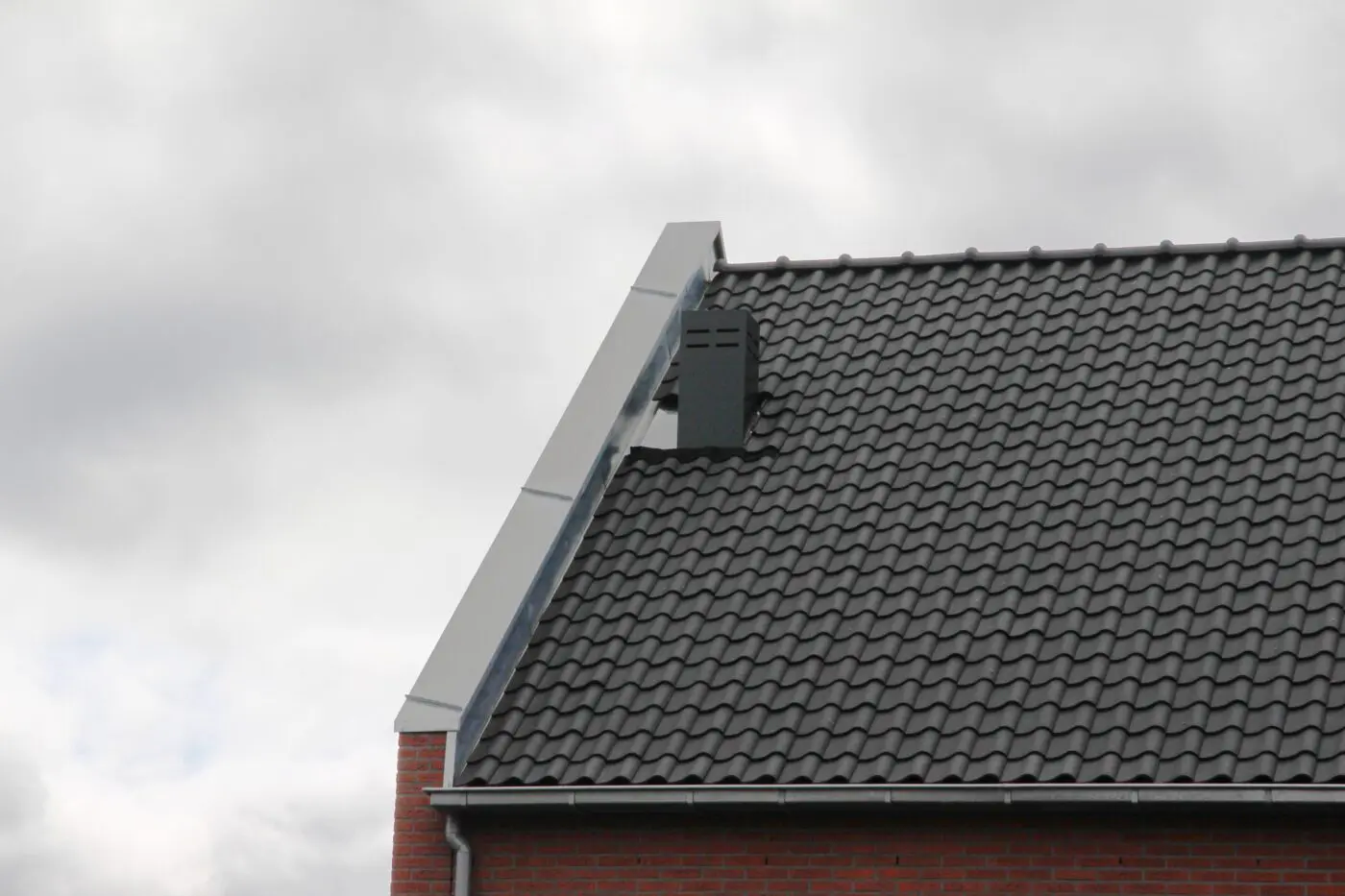 Dit dak is afgewerkt met een zinken afdekker met daaraan een verholen goot onder de dakpannen. Jammer is die dakdoorvoer zo dicht langs de rand. Mooi bedacht wellicht, maar aan de linkerkant daarvan krijg je in de praktijk dus geen pannen gelegd. Gelukkig wordt het zink nog dof, zodat het wat minder op gaat vallen.