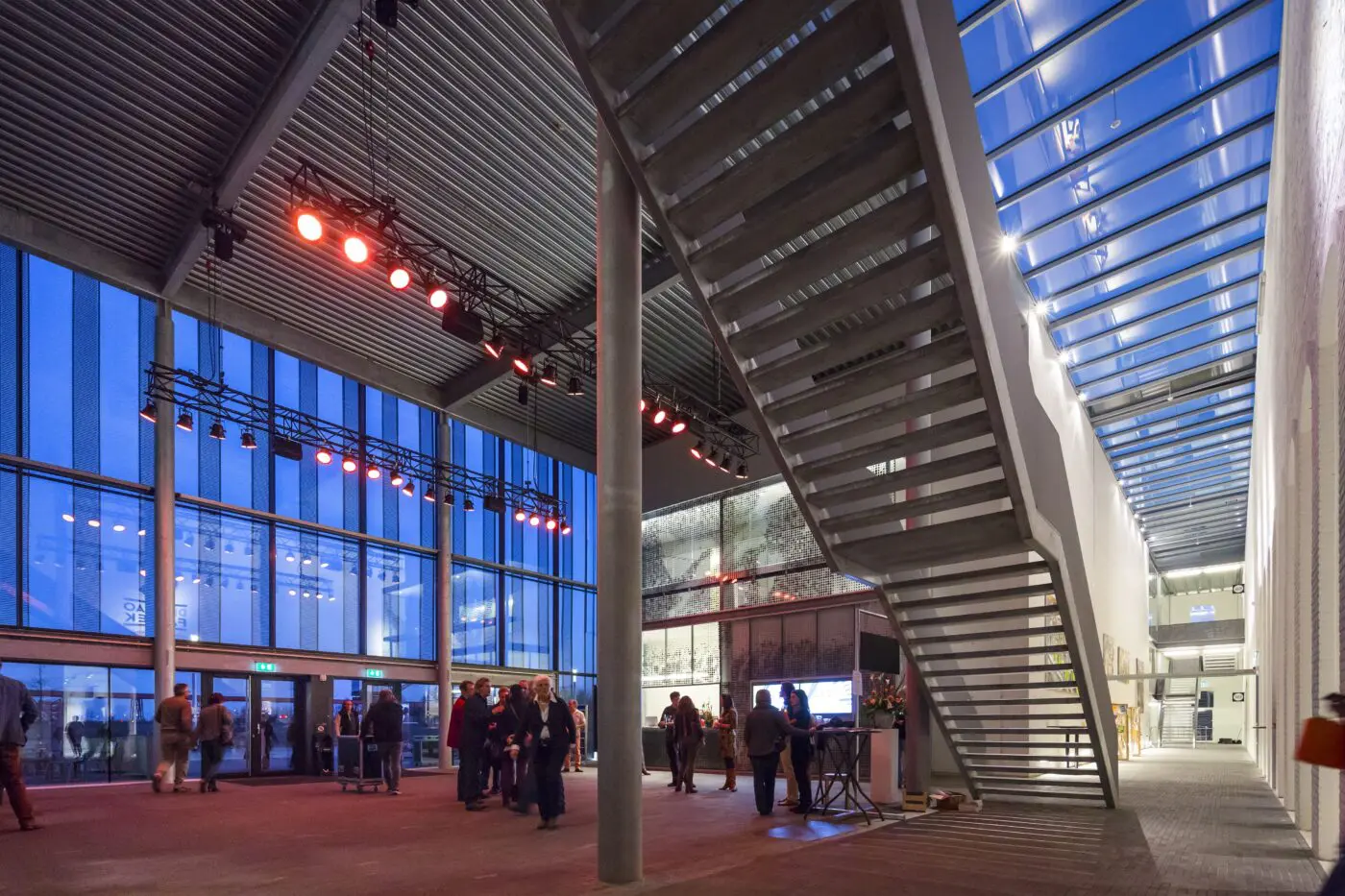 De voormalige cacaofabriek in Helmond is nu een culturele hotspot. Opvallend zijn vooral de nieuwe daken met een vlakke beplating in rvs en de gevelbekleding van aluminium lamelroosters voor de aangebouwde popzaal.