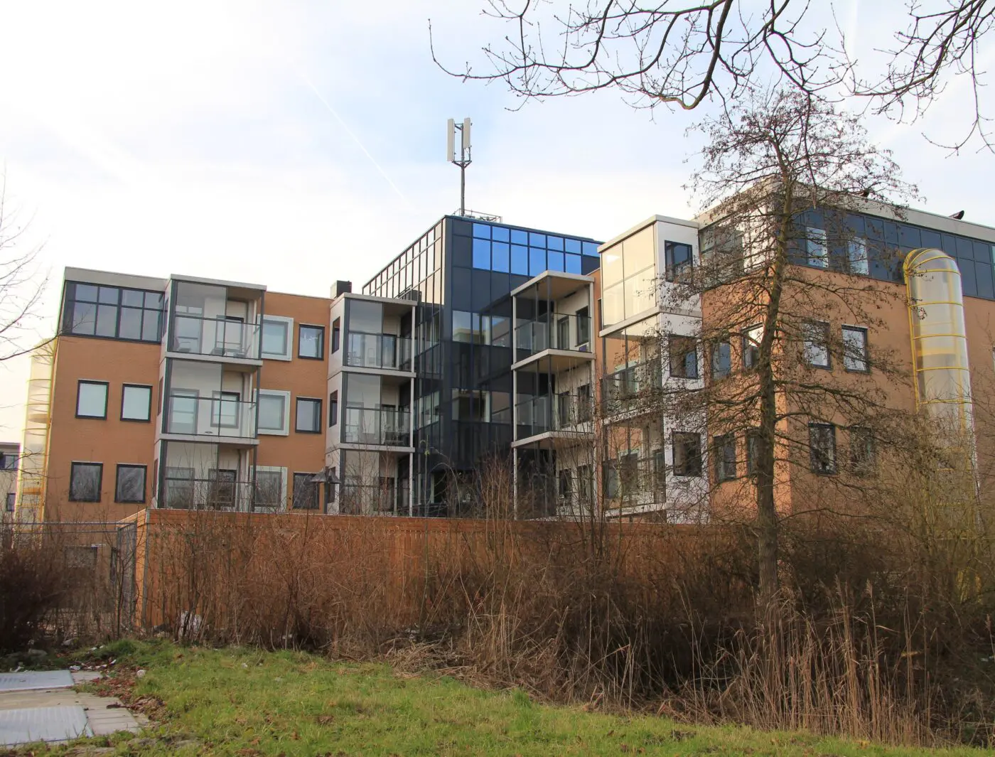 Bij de ombouw van een vierlaags kantoorgebouw tot wooncomplex speelde de geluidbelasting op de gevel een belangrijke rol. Door de balkons en ramen voor spuiventilatie grotendeels af te schermen, werd een goede geluidwering bereikt.