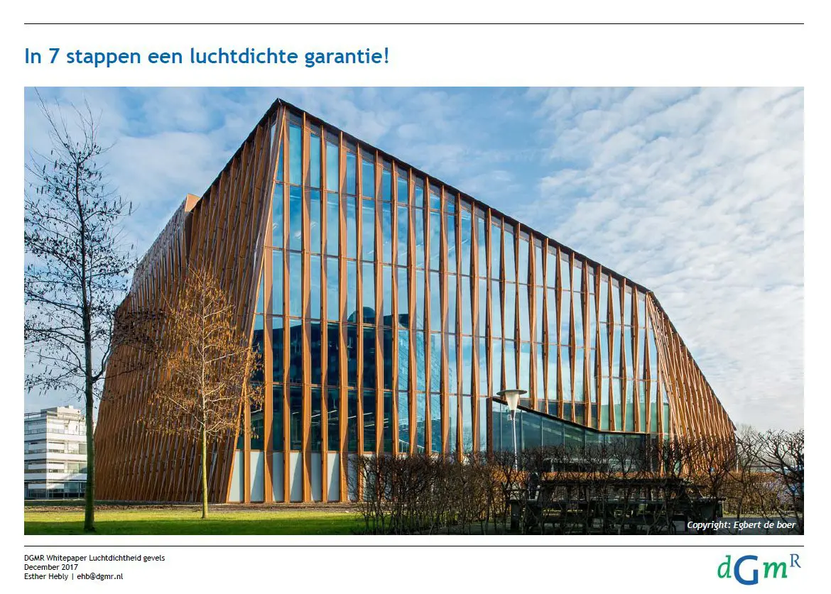 Het beperken van luchtlekkages in gebouwen is essentieel voor de beheersing van energielasten, het langdurig blijven functioneren van de constructie en het comfort en de gezondheid van mensen in het gebouw. Bijna Energie Neutrale Gebouwen (BENG) onderstreept vanaf 2019-2021 deze voordelen doordat het primair energieverbruik in gebouwen aan banden wordt gelegd en de kwaliteit van de gebouwschil daarin sterker meeweegt dan in de huidige situatie. Luchtdichtheid gaat een nog grotere rol spelen dan nu het geval is. Met de whitepaper ‘In 7 stappen een luchtdichte garantie’ neemt DGMR hierop een voorschot.
