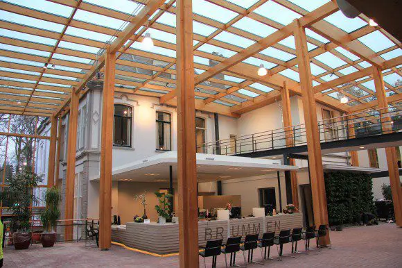 Het gemeentehuis werd door RAU Architecten uitgebreid met tijdelijke nieuwbouw. Het architectenbureau koos ervoor de monumentale villa uit 1890 in oude luister te herstellen en daar een U-vormige tweelaagse uitbreiding omheen te plaatsen. De uitbreiding omarmt als het ware de oudbouw en daartussen is een atrium gecreëerd, als lichte en representatieve publiekshal. Op deze manier is de statige villa zowel vanaf de weg als vanuit de centrale hal prominent aanwezig. Bouwwereld schreef eerder al een artikel over dit project.