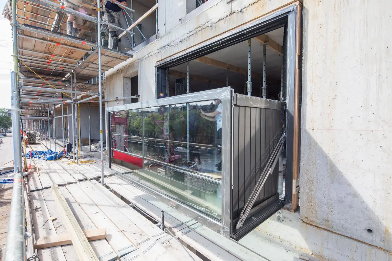 Wat veiligheid betreft, heeft een bewoner twee handen nodig om het balkon te bedienen (deadman control). Als onverhoopt de elektriciteit uitvalt, kan je het balkon met een spindel handmatig inklappen en als de winddruk te hoog is voor uitklappen, geeft het balkon een signaal. De gevelbouwer krijgt het balkon als een kant en- klaar product dat enkel nog gemonteerd moet worden. In Amsterdam installeerde Schipper Kozijnen het balkon, maar terwijl het installeren echt geen rocket science is – inhijsen, afstellen, schroeven en klaar – moesten de monteurs van Schipper toch eerst door Kawneer in Frankrijk getraind worden voordat ze in Amsterdam aan de slag konden.