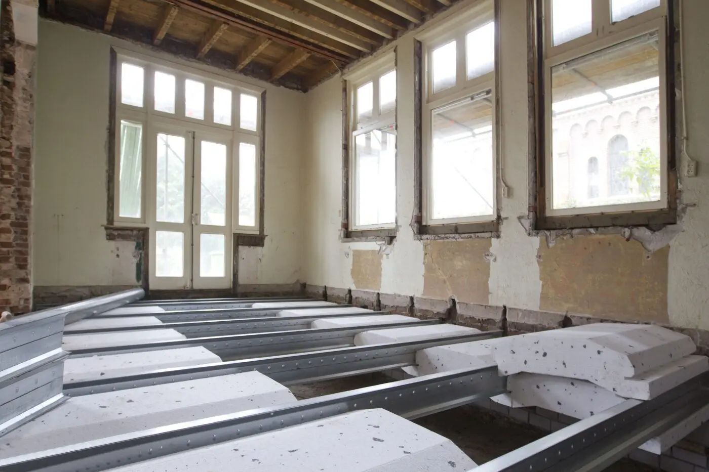 Vooral die laatste eigenschap maakt het vloersysteem bijzonder geschikt voor jaren ’50 en ‘60 (rij)woningen op lichte funderingen. In de praktijk werkt de methode even snel als simpel. Nadat timmerlieden eerst de oude balklaag hebben verwijderd, kunnen de kunststof liggers handmatig erin. Vervolgens worden de PS-elementen ertussen geschoven. Afsluitend vindt de afwerking met folie en plaatmateriaal plaats.
