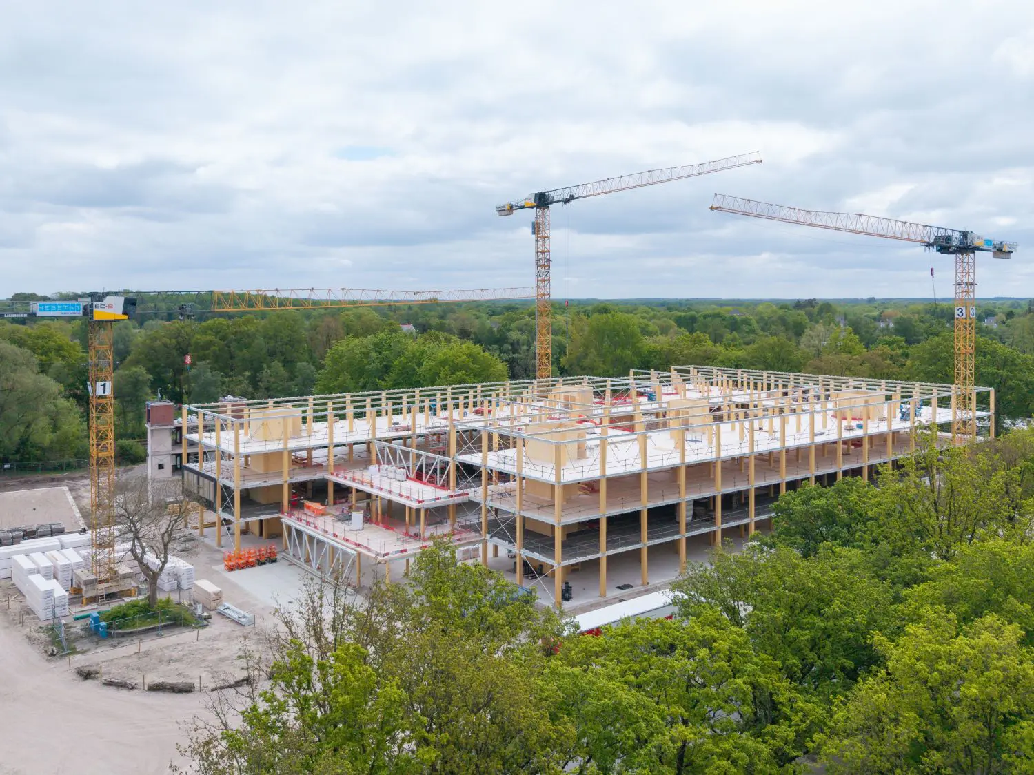 - Hybride constructie met houten kolommen en stalen liggers voor flexibiliteit en compactheid.