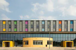De blokken worden met elkaar verbonden door de tweede verdieping. Deze bovenste laag, met een compositie van alle afdelingskleuren, herbergt de gemeenschappelijke theorie- en praktijklokalen en staffuncties. Ook in het sportgebouw tegenover de school komen de afdelingskleuren terug.