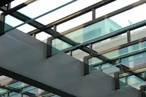 De glazen liggers zijn in U-vormige schoenen opgehangen aan de staalconstructie. De schoenen zijn zo hoog mogelijk geplaatst, waardoor de bovenkant van de glazen ligger ruim boven het staal uit komt. De glazen liggers zijn uitgevoerd in drie lagen floatglas van elk 12 mm en steeds twee lagen pvb-folie ertussen.