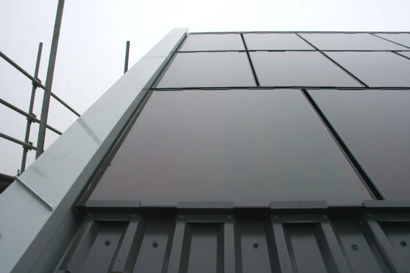 Amerikaanse pv-panelen (QS Solar Module, geproduceerd in China) boden mogelijkheden. Dit systeem wordt volgens projectvoorbereider Jeroen Booiman doorgaans alleen toegepast op platte daken van bedrijfshallen. ‘Op de reguliere versie zitten blank geanodiseerde metalen randen, maar we kwamen erachter dat er ook een versie is met donker geanodiseerde randen. Wat uiterlijk betreft zie je dan alleen een zwarte glasplaat.’