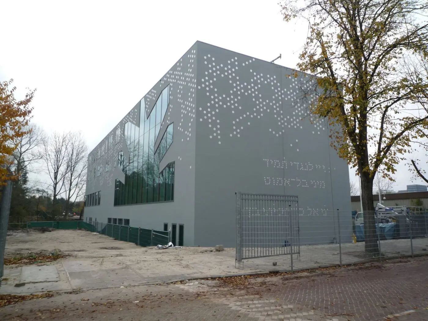 Tegelpatronen in de vorm van Davidsterren verlevendigen de gestuukte prefab betonnen gevel van de nieuwe synagoge in Amsterdam-zuid. De gebedsruimte bevindt zich tussen de twee grote menora-vormige ramen, die de doorsnede van de sjoel volgen.