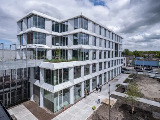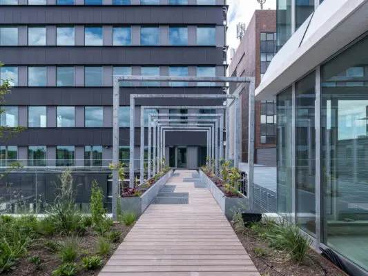 Kantorencomplex Max & Moore wil een voorbeeld zijn voor gezond werken in de stad. Dit dankzij een natuurinclusieve werkomgeving, die ook bijdraagt aan de aanwezige biodiversiteit. Geïntegreerde PV-panelen en een hoge mate van flexibiliteit maken de kantoren duurzaam en toekomstbestendig.