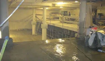 De Pinth: “Die vloer was 60 centimeter dik. We hebben een nieuwe vloer gemaakt van 30 centimeter. Het verschil van 30 centimeter hadden we nodig om een derde parkeerlaag te kunnen maken.” De nieuwe vloeren zijn geconstrueerd van plaatstaal, dat op dit moment nog worden ondersteund door stempels. Deze week, vlak voor de vakantie, wordt er beton op gestort.