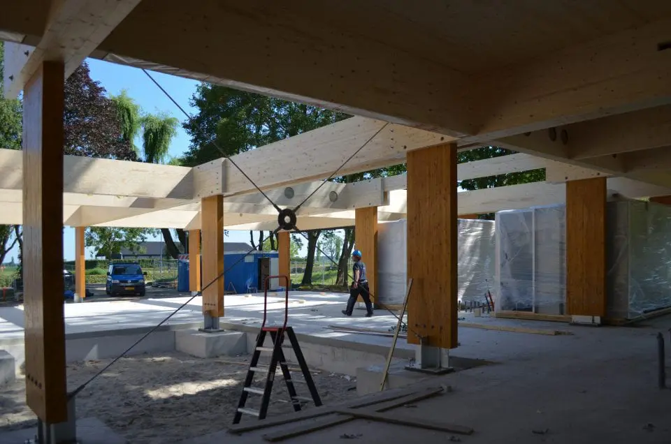 Het nieuwe kantoor van Industrieschap Medel bestaat uit een prefab houten draagconstructie met gelamineerde portaalspanten en gelamineerde dakliggers daartussen. De gelamineerde kolommen van de spanten zijn met larikshout samengesteld; de dubbele dakliggers met vurenhout. De dakvloer bestaat uit kruislaaghout van 110 mm dik. Tussen de gelamineerde portalen zijn stijve zelfdragende hsb-elementen met een underlayment beplating aangebracht. De gevel bestaat uit een aluminium vliesgevelconstructie.