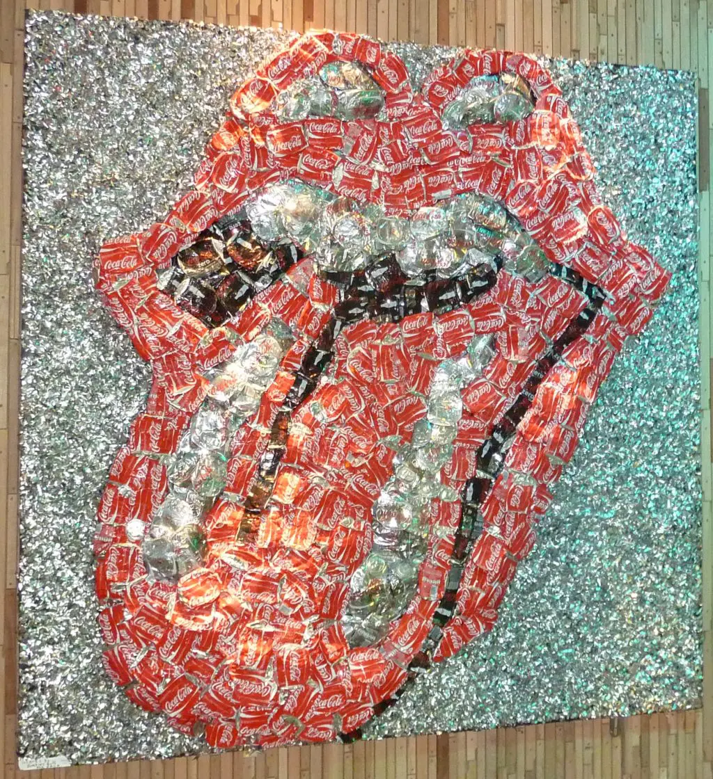 De beroemde Rolling Stones tong uitgevoerd in lege blikjes die warmte geeft. Het is een spectaculair werk van Jumping Bull AKA Geronimo. De tong, gemaakt in samenwerking met radiatorproducent Jaga, maakt deel uit van ‘Rocking the Art World’ in de Londense galerie SymbolicLondon.