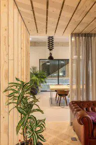 Binnen is direct duidelijk dat het weghalen van vloeren en muren letterlijk ruimte heeft geboden aan meer daglicht in het met 22 meter uitzonderlijk diepe, en voorheen dus donkere gebouw. Het constructieve raamwerk van het atrium is gevuld met geperforeerde houten panelen en stalen puien. Naast de akoestische kwaliteit zijn de wanden ook gebruikt voor het opnemen van de pantry’s, bibliotheek, kastruimte en display-plekken.