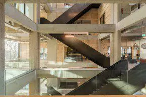 Het dynamisch karakter van het atrium wordt ruimtelijk versterkt door doorstekende stalen trappen, overhangende balkons, passages en doorzichten maar bovenal doordat de vide binnen het beton-grid per verdieping verspringt. Dit is aan de buitenzijde ook goed te zien: grote glasvlakken binnen de kaders van de betonnen draagconstructie sparen een Tetris-achtige vorm uit in de antraciet geschilderde gevel waardoor het gebouw ook een nieuwe identiteit kreeg.