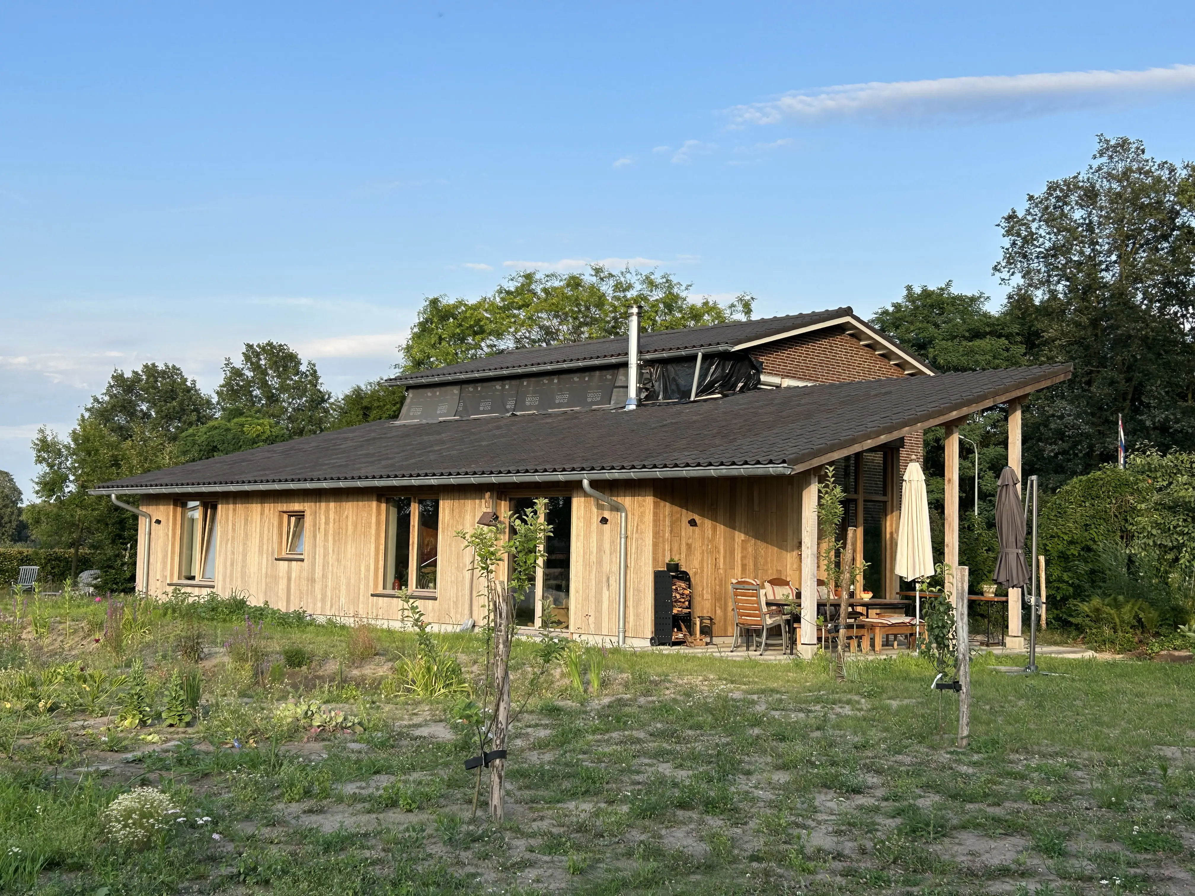 Naast de aanbouw is een wadi aangelegd om het regenwater te bufferen. Het bestaande woonhuis uit 1960 oogt klassiek maar de oorspronkelijke houten kozijnen zijn later vervangen door kunststof. Het contrast is tekenend voor de kloof in de bouwpraktijk, meent de architect. “Biobased materialen en een energiezuinig ontwerp zijn de toekomst. Maar daar is de bouwpraktijk nog niet op ingesteld.” De aannemers in de omgeving van Venlo konden of wilden niet aan de slag met de biobased bouwmethode. Houben was daarom noodgedwongen ook de hoofdaannemer van de verbouwing van haar woonhuis. “Dat was leuk, hoor. Maar willen we op grote schaal circulair bouwen, dan zullen we als eerste de aannemers moeten opvoeden.”
