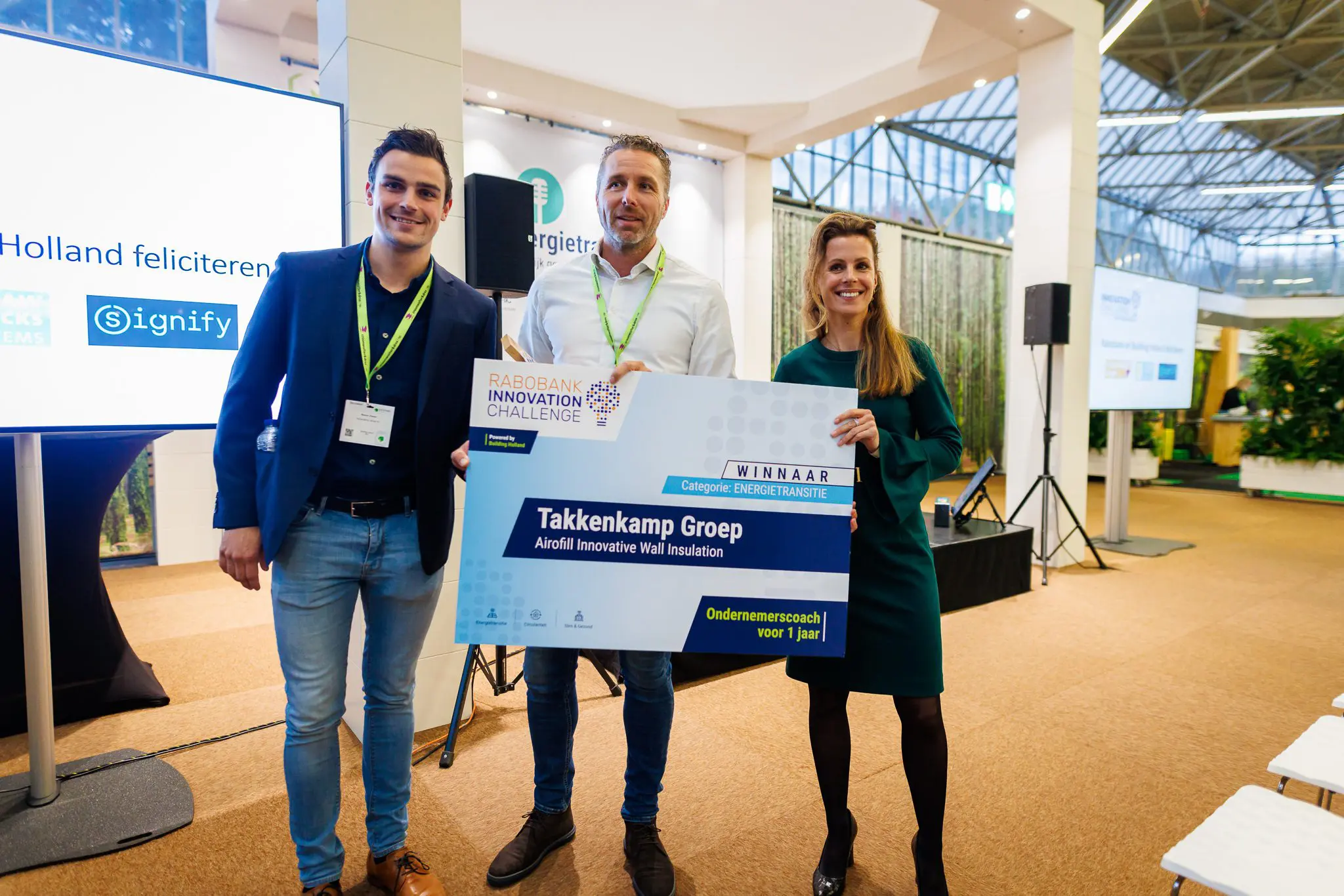 In de categorie Energietransitie won Takkenkamp met Airofill Innovative Wall Insulation, dit is een soort slurry die eenvoudig is aan te brengen via gaten in de voeg. De jury: “Takkenkamp heeft koplopend ondernemerschap getoond waarbij een grote technische sprong gehaald is in de isolatiewaarde. Bovendien is er potentie is om het product circulair toe te passen.”