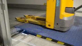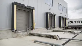 Om die reden werd er ook een extra dikke Crawford OH370 overheaddeur geplaatst. Met een dikte van 70 millimeter blijft het binnenklimaat optimaal behouden. Daarnaast valt het oog meteen op de vorm van de deur. Aan weerszijden is aan de onderkant een inkeping zichtbaar. Een aanpassing die nodig was om de overheaddeuren voor de deuren langs te krijgen. Maatwerk op verzoek. FrieslandCampina stelde als eis dat de levellers afgeschermd moeten zijn. Daarom gaan de overheaddeuren voor de levellers langs en liggen de levellers verder naar binnen. De uitschuifbare lip van de teledock leveller heeft een lengte van 1 meter. Mede door het maatwerk van ASSA ABLOY Entrance Systems kon FrieslandCampina alweer snel van start met het logistieke proces. Belangrijker nog: dit gaat helemaal volgens alle hygiëne- en voedselveiligheidsvoorschriften. Dankzij het uitgebreide pakket aan toegangsoplossingen kan FrieslandCampina haar kazen veilig en hygiënisch over de hele wereld transporteren.