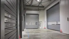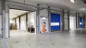 Ook leverde ASSA ABLOY Entrance Systems de snelroldeur Albany RR392. Wanneer het vlakke deurblad zich ontvouwt, worden de metershoge plankconstructies met kaas zichtbaar. De verse kaas wordt via een lopende band vanuit het pekelhuis naar de opslagruimte verplaatst. Hier rijpen de kazen op houten planken. Na voltooiing van dit proces is de kaas klaar om bewerkt te worden op de kaasbehandellijnen. Vervolgens zetten de AGV’s de kazen over op kleinere stellages. Vanuit hier kunnen de kazen mee op transport. De snelroldeur vormt de overgang tussen de koele kaasopslag en de warmere transportruimtes. De keuze voor het deurblad was een overweging vanuit hygiënisch oogpunt. Door het gladde oppervlak blijven er minder bacteriën achter en is het deurblad makkelijker te reinigen.